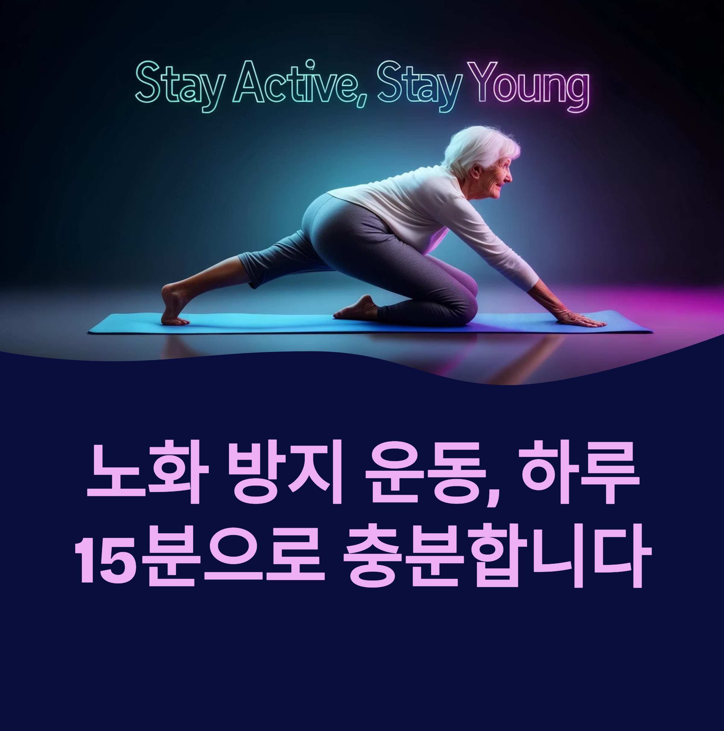 노화는 피할 수 없지만, 늦추는 건 가능합니다. 하루 15분만 투자해도 내 몸은 분명히 변화합니다. 운동은 특별한 공간이 필요하지 않습니다. 지금 이 순간, 가벼운 스트레칭부터 시작해보세요. ‘늦었다’고 생각한 지금이 가장 빠른 시점입니다. 오늘도 건강한 노화를 위한 한 걸음을 내디뎌보세요!