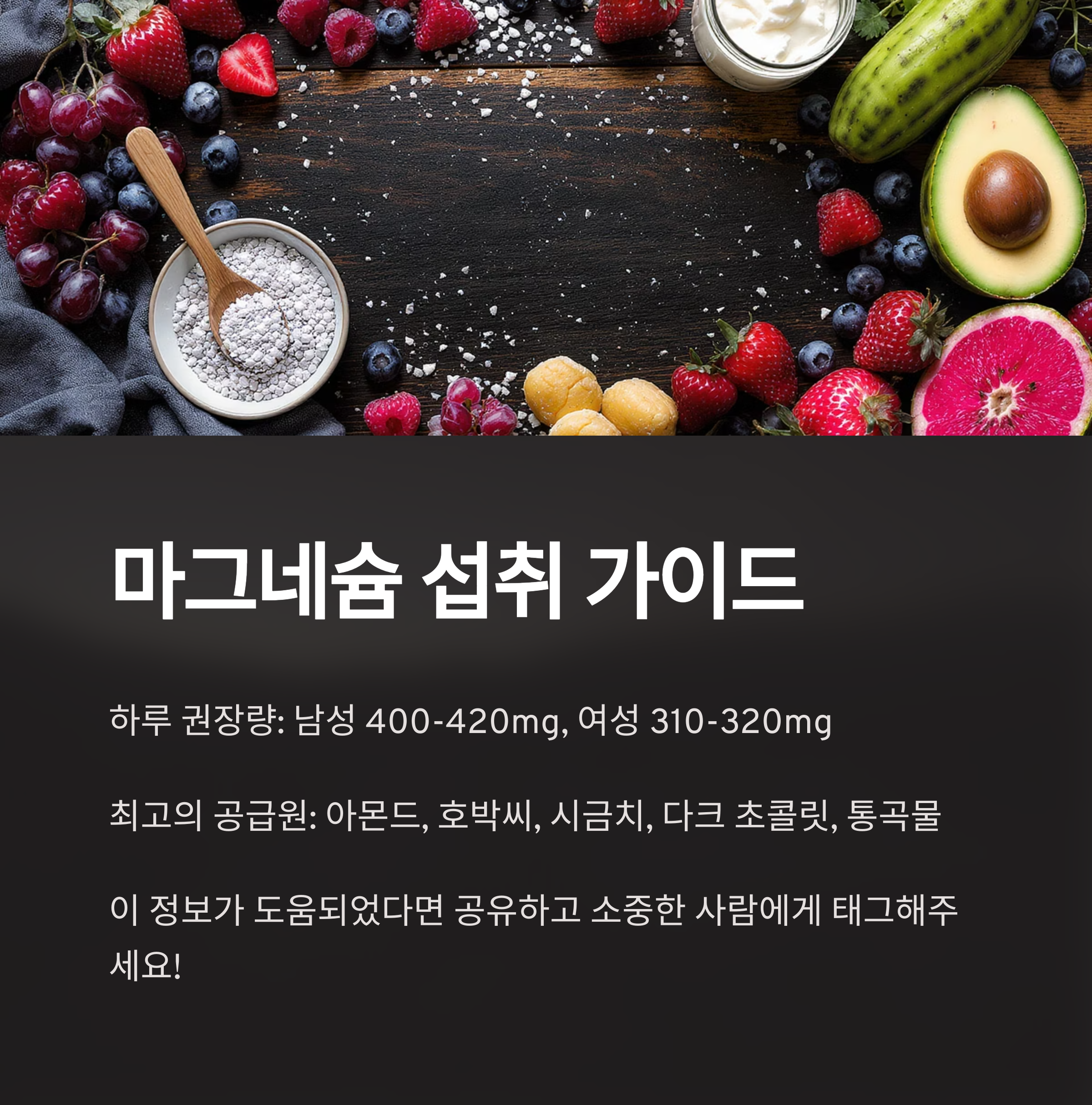 마그네슘의 다양한 역할과 심장 건강에 미치는 중요한 영향을 완벽 분석합니다. 마그네슘 결핍 증상, 하루 권장량, 풍부한 식품, 효과적인 섭취법까지 심혈관 건강을 위한 마그네슘 가이드를 제시합니다.