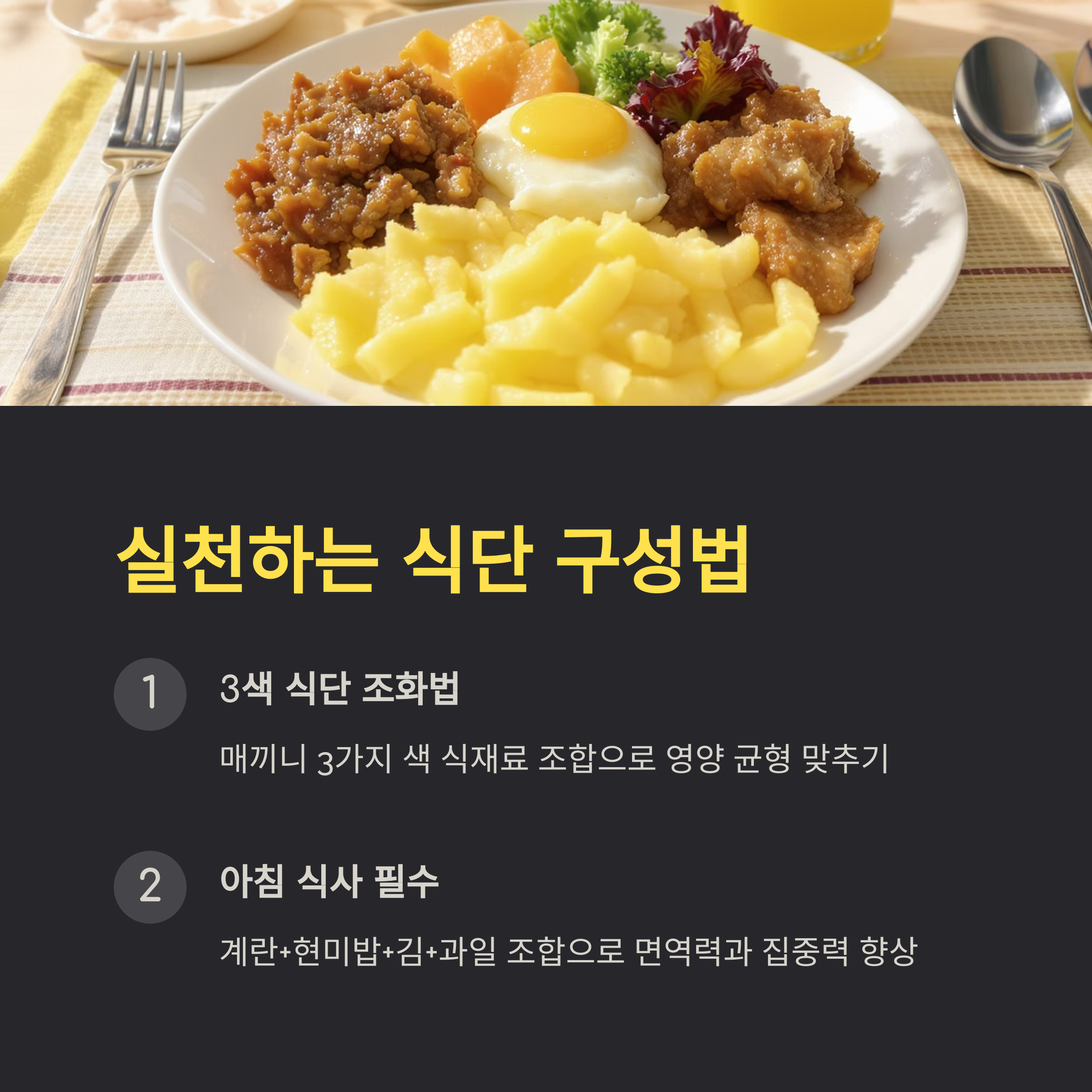 아침을 거르면 면역력이 낮아집니다. 특히 공복이 길면 위장 기능도 약해지고 집중력 저하로 이어지죠. 추천 아침 식단: - 계란후라이 + 현미밥 + 김 + 바나나 - 닭죽 + 삶은 고구마 + 요구르트 - 시리얼 + 우유 + 견과류 + 블루베리