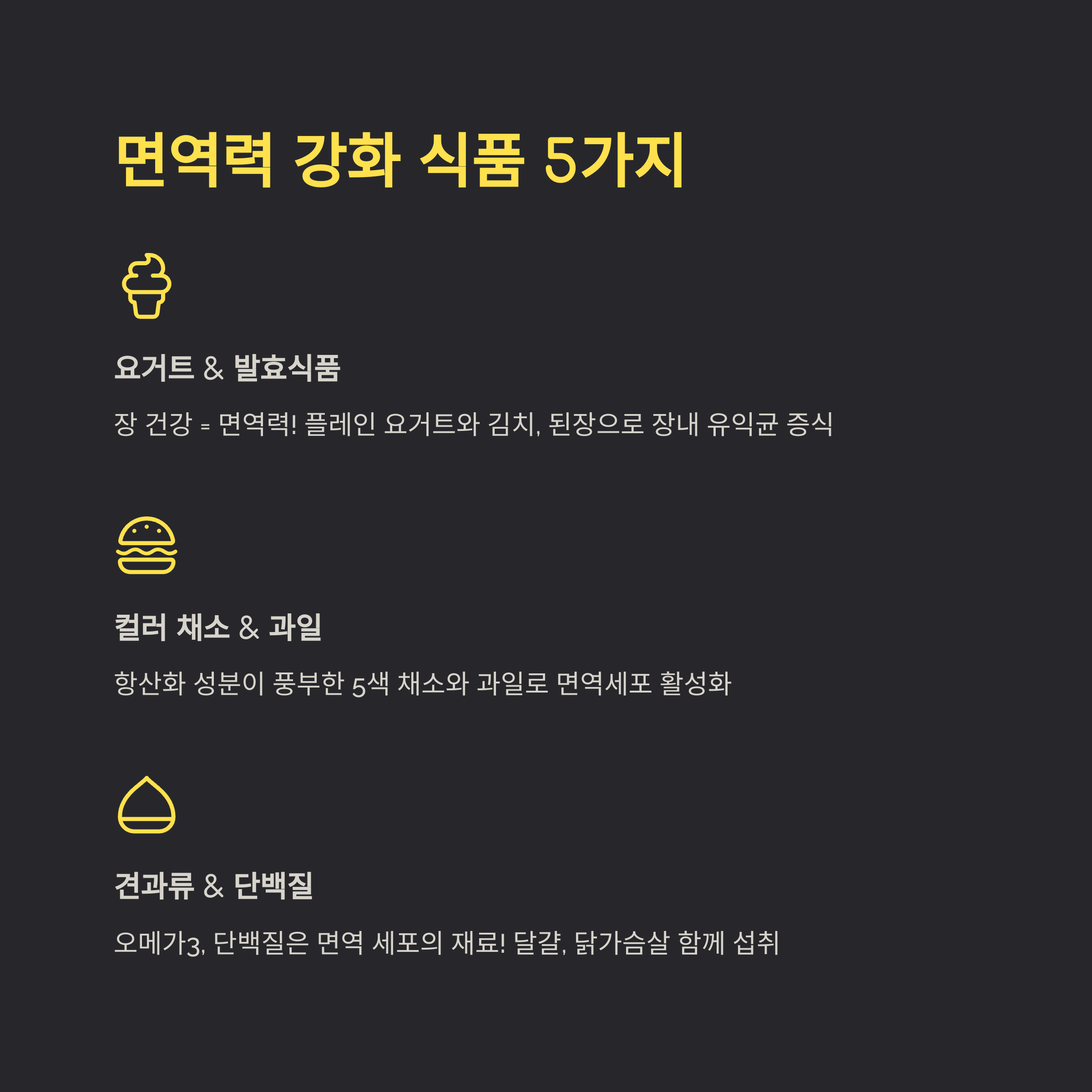 | 채소 & 과일 | 항산화 비타민 풍부 → 감염 예방 |