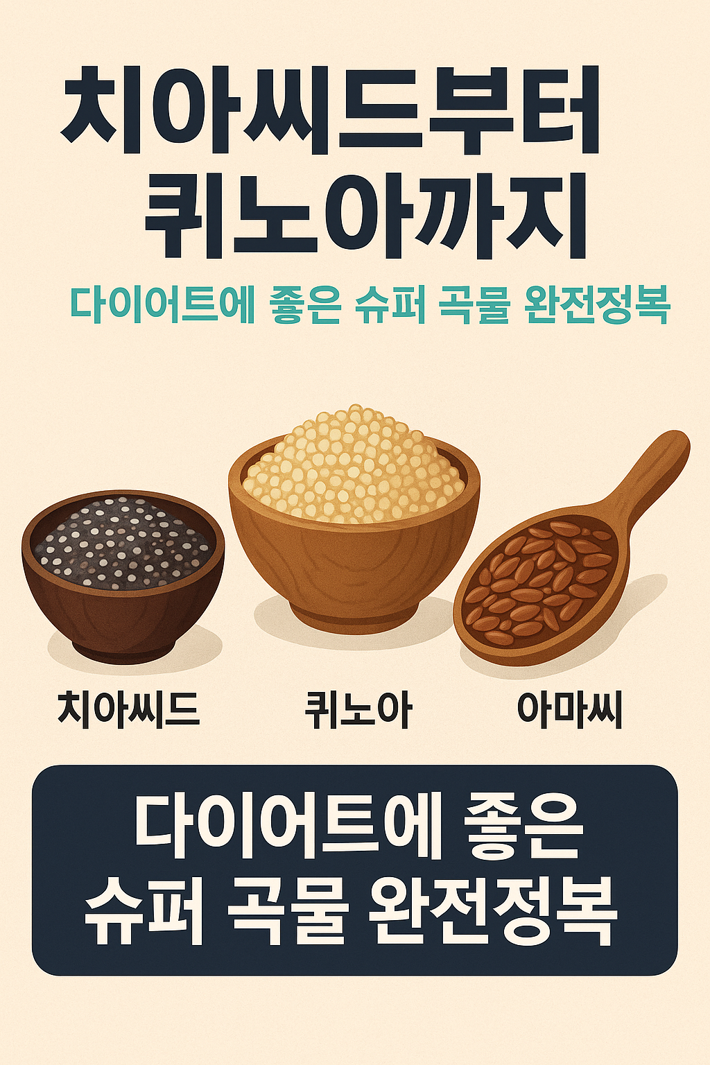 치아씨드, 퀴노아, 아마씨는 다이어트를 꿈꾸는 이들에게 빠질 수 없는 슈퍼 곡물입니다. 포만감은 물론, 영양까지 꽉 채운 이 곡물들의 모든 것을 지금 만나보세요!