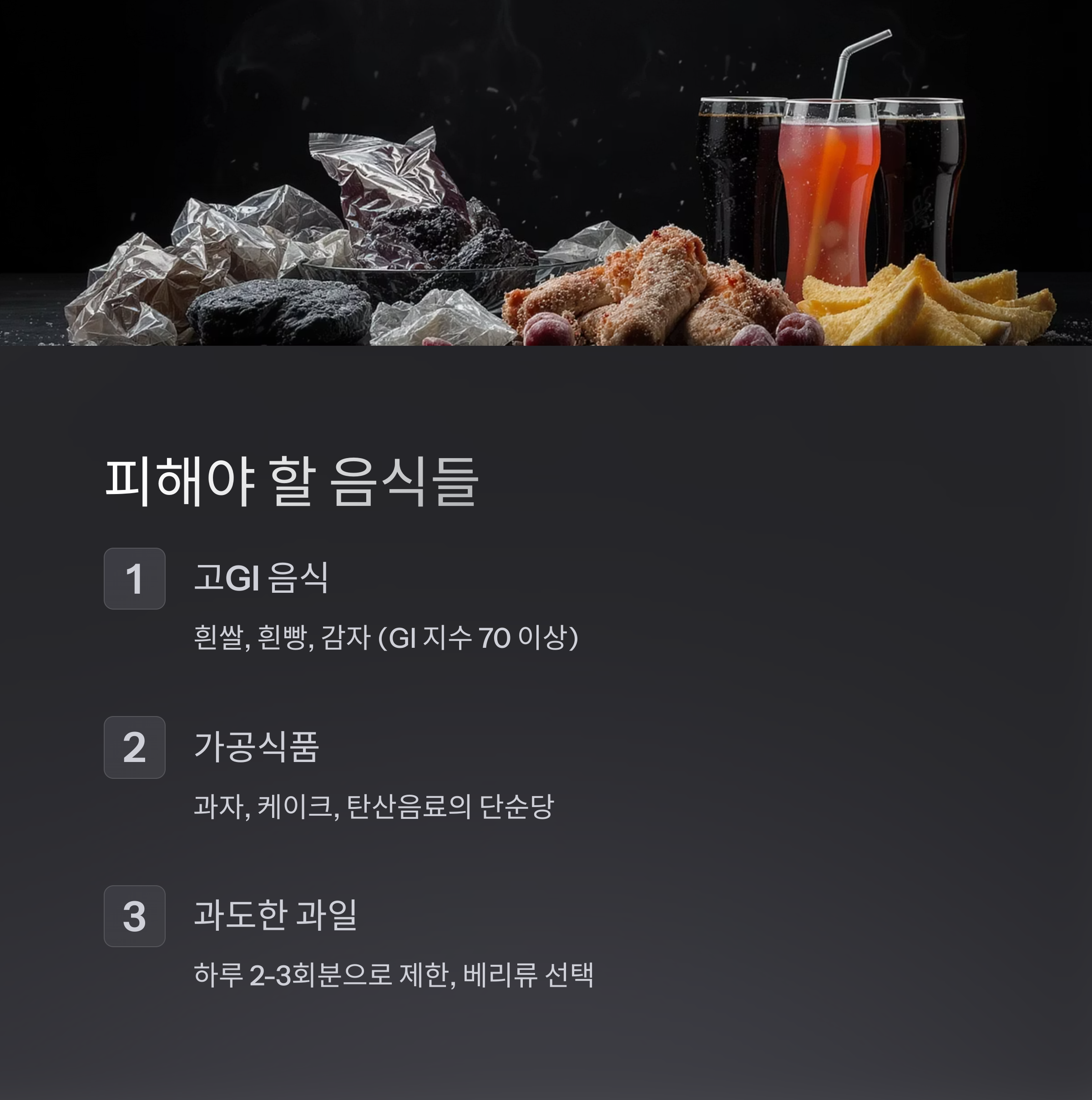 과자, 케이크, 사탕, 탄산음료 등 가공된 단순당이 많은 음식들은 혈당을 급격히 올립니다. 이런 음식들 대신 자연 그대로의 음식을 선택하고, 단맛이 필요할 때는 스테비아나 에리스리톨 같은 천연 감미료를 사용하세요.
